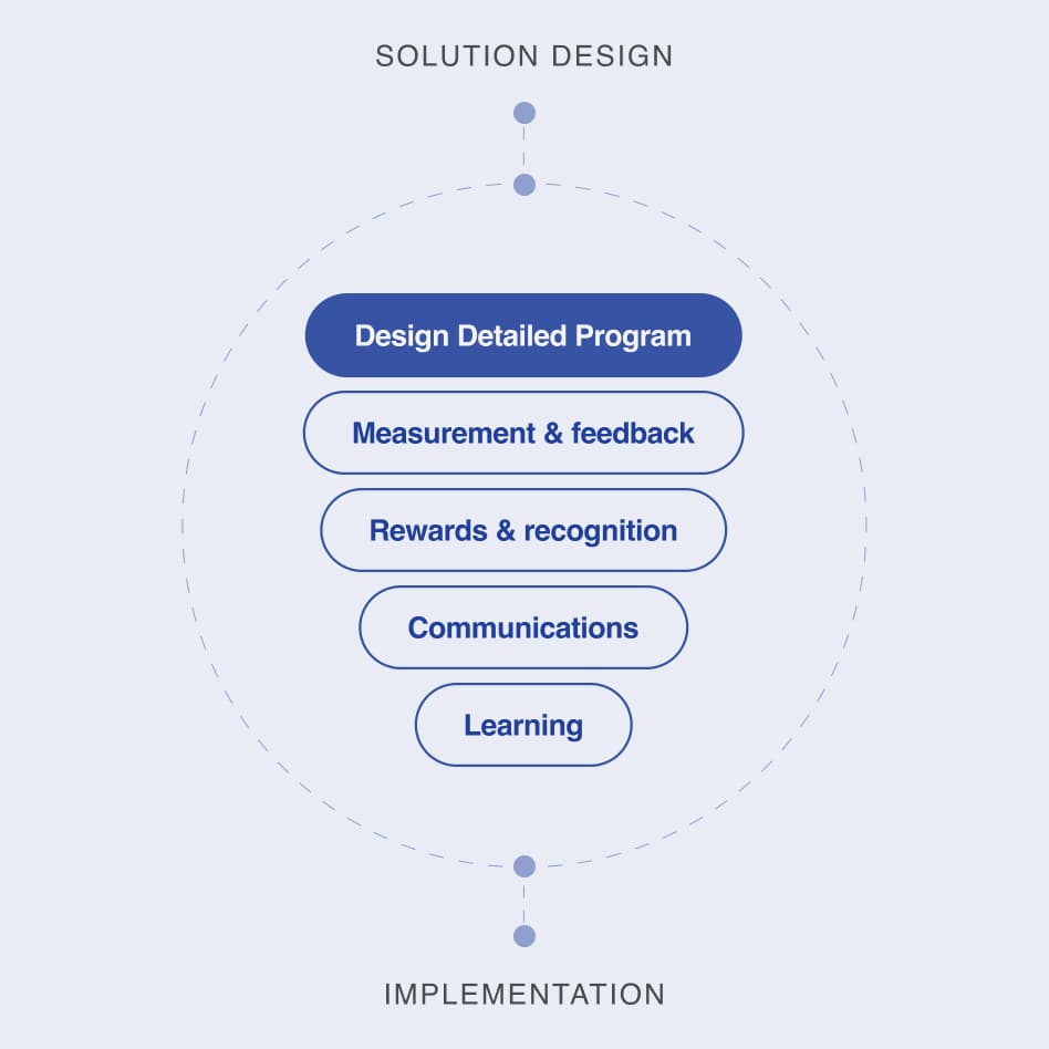 We design and develop a detailed solution. The program includes all communication, measurement metrics, feedback loops and learning mechanisms.